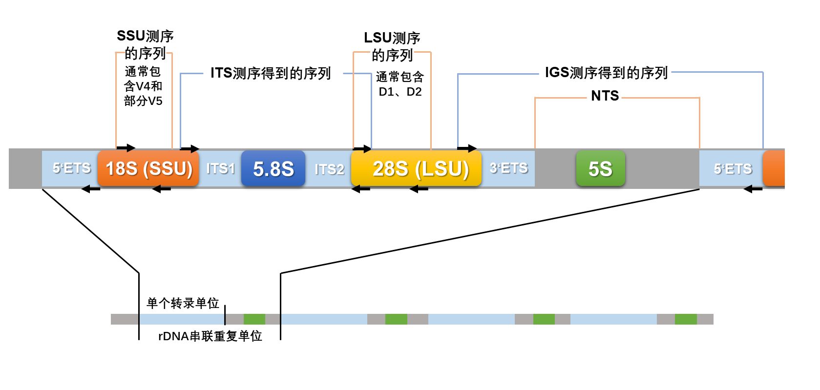 18S rDNA转录产物构成核糖体的小亚基,因此被称为核糖体小亚基基因序列(SSU),剩下三者共同构成核糖体大亚基,但一般仅有28S rDNA被称为核糖体大亚基基因序列(LSU)。在18S、5.8S和28S基因之间的片段称为ITS序列。注意,实际研究中测序的SSU和LSU序列通常不完整,而获得的ITS序列往往还包括一部分的SSU、完整5.8S和一部分LSU序列。