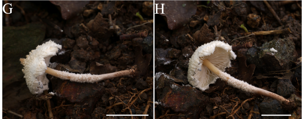 欧氏粉鳞环柄菇最初被描述于葡萄牙,当时被置于囊小伞属中,后来Qu et al. 2023将其转移到粉鳞环柄菇属中。该物种的特征是菌盖白色至奶油色,表面覆盖有直立丛毛状鳞片,来自中国的标本在菌盖中部有凸起,菌柄褐色覆有丛毛状鳞片,无囊状体,孢子粗糙,在梅氏试剂中...... | ![]() |